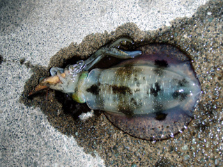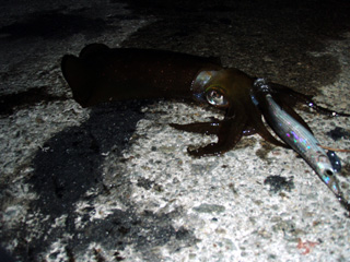 もう?日本海での春アオリイカは終わりかけ?終わっている??だろうと思っていますが友達と常神半島に行ってきましたが!?気温の高さか??赤潮が・・・仕方がないので小浜で釣りをしましたが・・・ヤエン仕掛けの人にもアタリがないみたい・・・そうなると!?餌にも反応ないのにエギにあるはずもなくアオリイカはボウズ・・・帰ろうと思いながら防波堤の際を懐中電灯で照らしていたらマダコがへばりついていたので網で捕獲することに成功してボウズは逃れました。 |