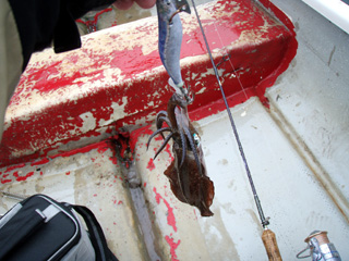 今年もアオリイカの季節がやって来ました!防波堤から釣りをするも良いのですが、誰もしていない場所で釣りをしたいので西小川で手漕ぎボートを借りてのボートエギング!これでまだスレていない純粋無垢なアオリイカをバンバン釣るつもりでしたが・・・湾内に大漁のサゴシ(サワラの子供)・シイラが入っていてアオリイカが釣れない状況に・・・天敵の影響を受けにくい浅場で頑張りましたが釣れるのはコロッケサイズだけでした。 |